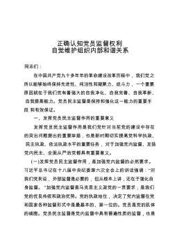 正确认知党员监督权利自觉维护组织内部和谐关系同志们:在中国共产党九十多年年的革命建设改革历程中,我们党之所以能够始终保持先进性、纯洁性和凝聚力、战斗力,一个重要原因就在于我们党有着强大的自我净化、自我完善、自我革新、自我提高能力。党员民主监督是保持和强化这一能力的重要手段和有效保证。一、发挥党员民主监督作用的重要意义发挥党员民主监督作用是我们党针对当前党的建设中存在的突出问题提出的重要举措,也是新时期切实提高党科学执政、民主执政、依法执政水平的重要任务,对于加强党内监督、发扬党内民主、全面从严治党都具有重要意义。(一)发挥党员民主监督作用,是加强党内监督的必然要求。习近平总书记在十八届中央纪委...