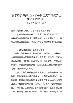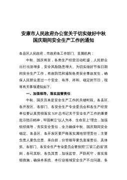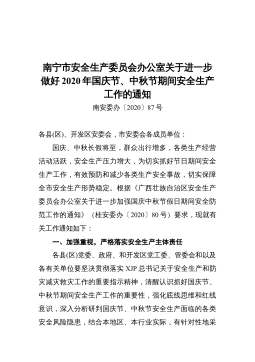 南宁市安全生产委员会办公室关于进一步做好2020年国庆节、中秋节期间安全生产工作的通知南安委办〔2020〕87号各县(区)、开发区安委会,市安委会各成员单位:国庆、中秋长假将至,群众出行增多,各类生产经营活动活跃,安全生产压力增大,为切实抓好节日期间安全生产工作,有效预防和减少各类生产安全事故,切实保障全市安全生产形势稳定。根据《广西壮族自治区安全生产委员会办公室关于进一步加强国庆中秋节假日期间安全防范工作的通知》(桂安委办〔2020〕80号)要求,现就有关工作通知如下:一、加强重视,严格落实安全生产主体责任各县(区)党委、政府、和开发区党工委、管委会和以及各有关单位要坚决贯彻落实XJP总书记...