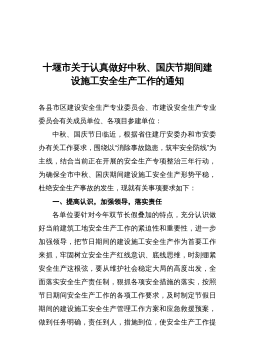十堰市关于认真做好中秋、国庆节期间建设施工安全生产工作的通知各县市区建设安全生产专业委员会、市建设安全生产专业委员会有关成员单位、各项目参建单位:中秋、国庆节日临近,根据省住建厅安委办和市安委办有关工作要求,围绕以“消除事故隐患,筑牢安全防线”为主线,结合当前正在开展的安全生产专项整治三年行动,为确保全市中秋、国庆期间建设施工安全生产形势平稳,杜绝安全生产事故的发生,现就有关事项要求如下:一、提高认识,加强领导,落实责任各单位要针对今年双节长假叠加的特点,充分认识做好当前建筑工地安全生产工作的紧迫性和重要性,进一步加强领导,把节日期间的建设施工安全生产作为首要工作来抓,牢固树立安全生产红线意识...