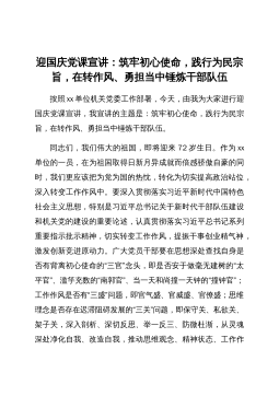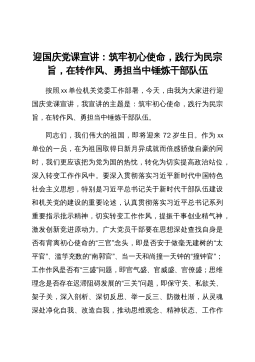 迎国庆党课宣讲:筑牢初心使命,践行为民宗旨,在转作风、勇担当中锤炼干部队伍按照xx单位机关党委工作部署,今天,由我为大家进行迎国庆党课宣讲,我宣讲的主题是:筑牢初心使命,践行为民宗旨,在转作风、勇担当中锤炼干部队伍。同志们,我们伟大的祖国,即将迎来72岁生日。作为xx单位的一员,在为祖国取得日新月异成就而倍感骄傲自豪的同时,我们更应该把为党为国的热忱,转化为切实提高政治站位,深入转变工作作风中。要深入贯彻落实习近平新时代中国特色社会主义思想,特别是习近平总书记关于新时代干部队伍建设和机关党的建设的重要论述,认真贯彻落实习近平总书记系列重要指示批示精神,切实转变工作作风,提振干事创业精气神,激发...