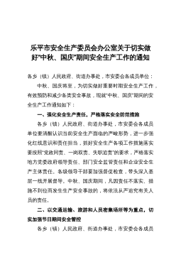 乐平市安全生产委员会办公室关于切实做好“中秋、国庆”期间安全生产工作的通知各乡(镇)人民政府、街道办事处,市安委会各成员单位:中秋、国庆将至,为切实做好重要时期安全生产工作,有效预防和减少各类安全事故,现就“中秋、国庆”期间的安全生产工作通知如下:一、强化安全生产责任,严格落实安全防范措施各乡(镇)人民政府、街道办事处,市安委会各成员单位要清醒认识当前安全生产面临的严峻形势,进一步强化红线意识和责任担当,抓好安全生产各项工作措施落实要按照“党政同责、一岗双责、失职追责”的要求,严格落实地方党委政府领导责任、部门安全监管责任和企业安全生产主体责任。各级领导干部要加强督促检查,带头深入基层一线开展...
