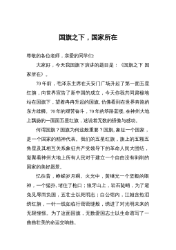 国旗之下,国家所在尊敬的各位老师,亲爱的同学们:大家好,今天我国旗下演讲的题目是:《国旗之下国家所在》。70年前,毛泽东主席在天安门广场升起了第一面五星红旗,向世界宣告了新中国的成立,今天你我共同肃穆地站在国旗下,望着冉冉升起的国旗,仿佛看到在世界奔跑的东方雄狮。70年的艰苦奋斗,70年的筚路蓝缕,在神州大地上飘扬的一面面五星红旗,述说着无数的骄傲与感动。何谓国旗?国旗为何这般重要?国旗,象征一个国家,是一个国家的精神代表。我们的五星红旗,旗上的五颗五角星及其相互关系象征共产党领导下的革命人民大团结,凝聚着神州大地上所有人民对于建立一个自由没有剥削的国家的美好愿景。忆往昔,峥嵘岁月稠。火光中,...