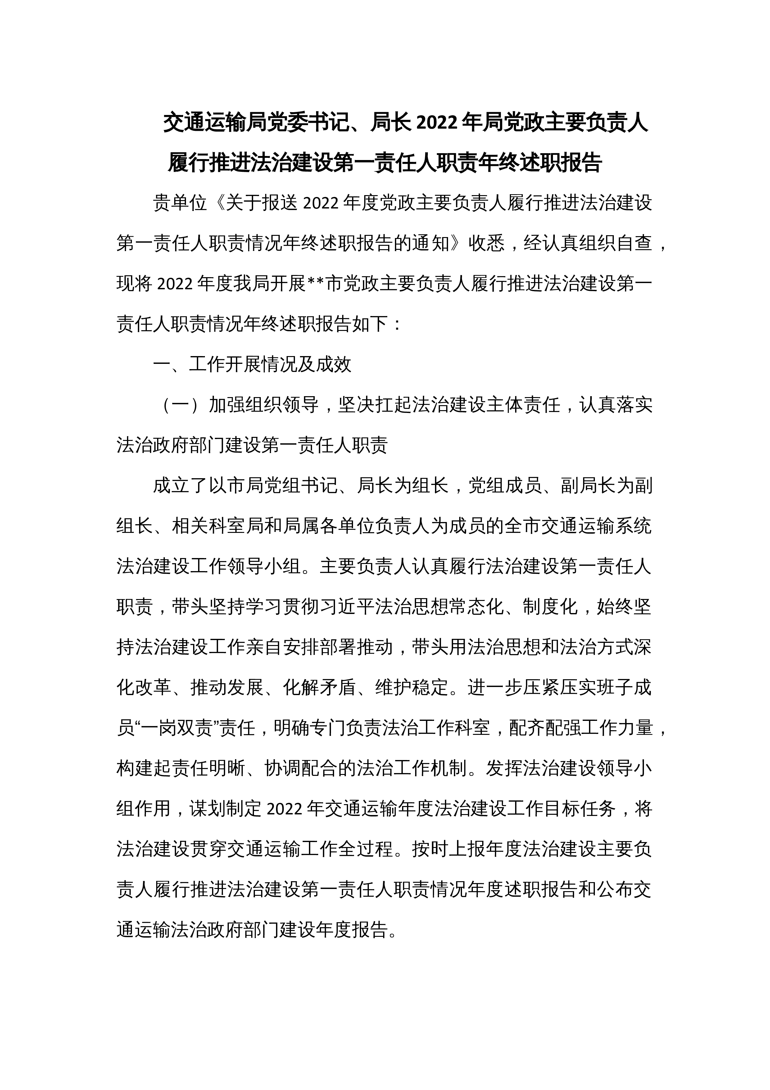 交通运输局党委书记、局长2022年局党政主要负责人履行推进法治建设第一责任人职责年终述职报告贵单位《关于报送2022年度党政主要负责人履行推进法治建设第一责任人职责情况年终述职报告的通知》收悉,经认真组织自查,现将2022年度我局开展**市党政主要负责人履行推进法治建设第一责任人职责情况年终述职报告如下:一、工作开展情况及成效(一)加强组织领导,坚决扛起法治建设主体责任,认真落实法治政府部门建设第一责任人职责成立了以市局党组书记、局长为组长,党组成员、副局长为副组长、相关科室局和局属各单位负责人为成员的全市交通运输系统法治建设工作领导小组。主要负责人认真履行法治建设第一责任人职责,带头坚持学习...