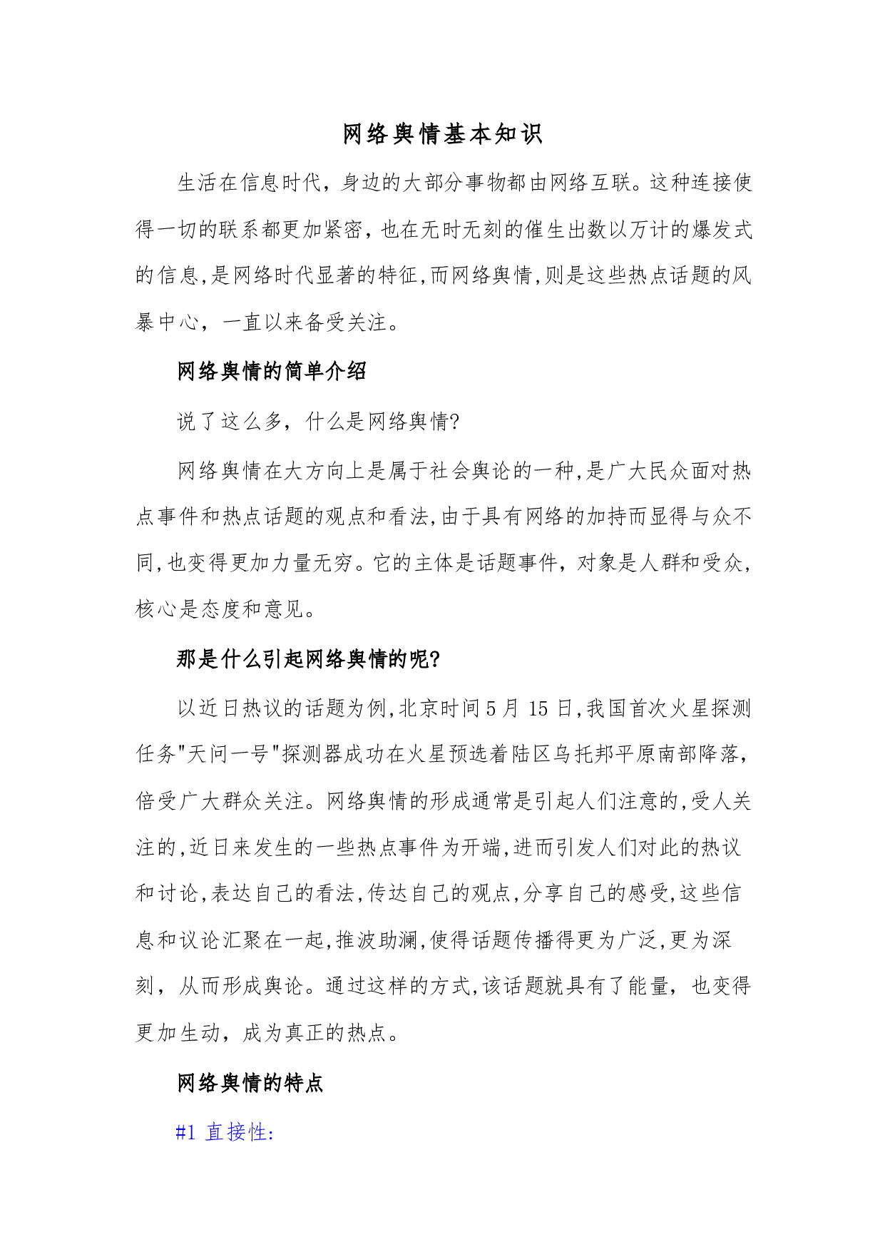 网络舆情基本知识生活在信息时代,身边的大部分事物都由网络互联。这种连接使得一切的联系都更加紧密,也在无时无刻的催生出数以万计的爆发式的信息,是网络时代显著的特征,而网络舆情,则是这些热点话题的风暴中心,一直以来备受关注。网络舆情的简单介绍说了这么多,什么是网络舆情?网络舆情在大方向上是属于社会舆论的一种,是广大民众面对热点事件和热点话题的观点和看法,由于具有网络的加持而显得与众不同,也变得更加力量无穷。它的主体是话题事件,对象是人群和受众,核心是态度和意见。那是什么引起网络舆情的呢?以近日热议的话题为例,北京时间5月15日,我国首次火星探测任务"天问一号"探测器成功在火星预选着陆区乌托邦平原南...
