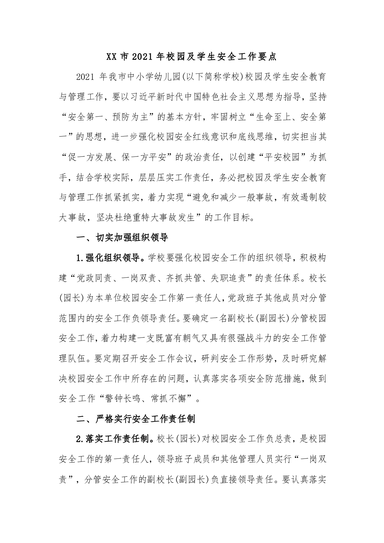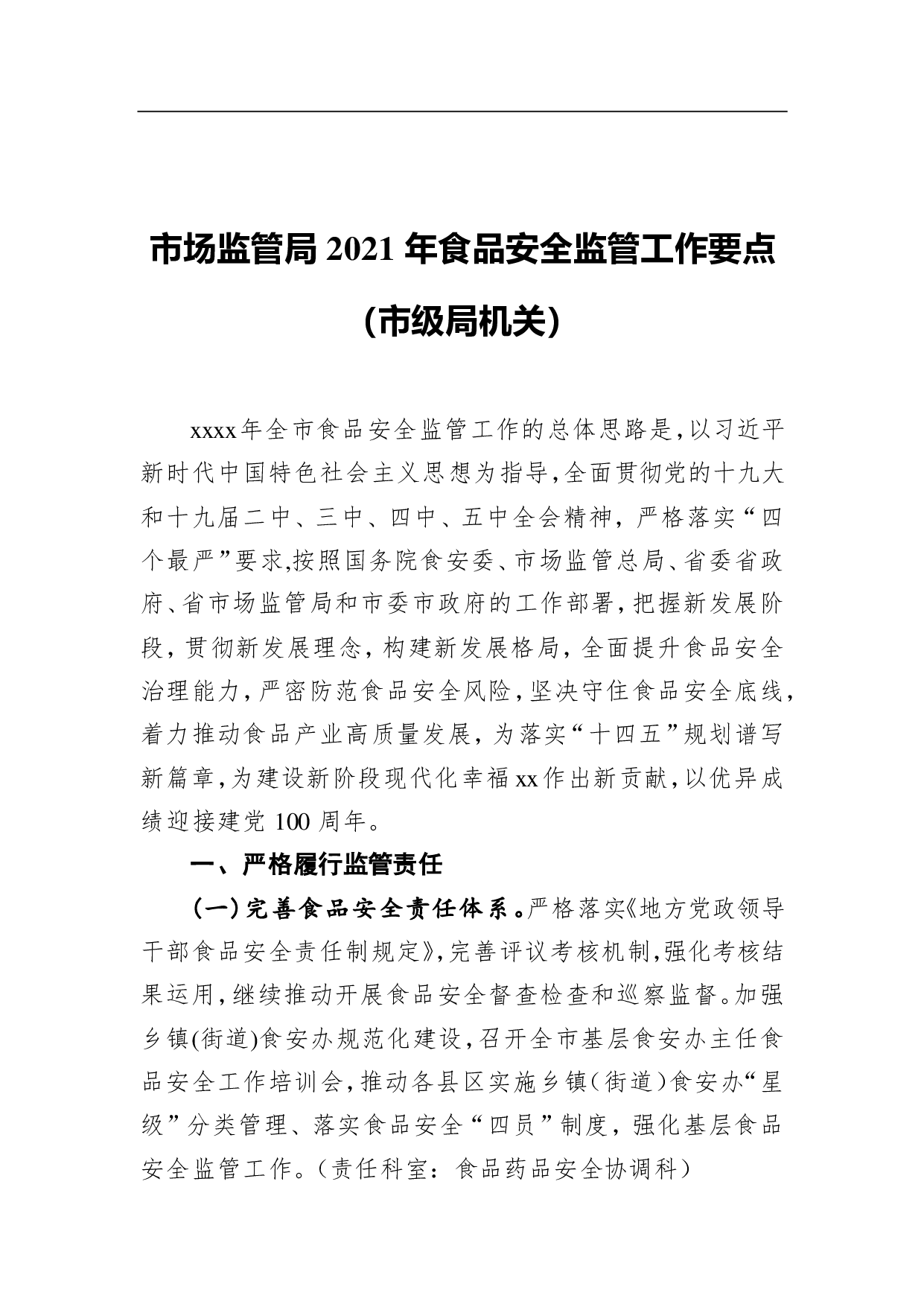 市场监管局2021年食品安全监管工作要点(市级局机关)xxxx年全市食品安全监管工作的总体思路是,以习近平新时代中国特色社会主义思想为指导,全面贯彻党的十九大和十九届二中、三中、四中、五中全会精神,严格落实“四个最严”要求,按照国务院食安委、市场监管总局、省委省政府、省市场监管局和市委市政府的工作部署,把握新发展阶段,贯彻新发展理念,构建新发展格局,全面提升食品安全治理能力,严密防范食品安全风险,坚决守住食品安全底线,着力推动食品产业高质量发展,为落实“十四五”规划谱写新篇章,为建设新阶段现代化幸福xx作出新贡献,以优异成绩迎接建党100周年。一、严格履行监管责任(一)完善食品安全责任体系。严...