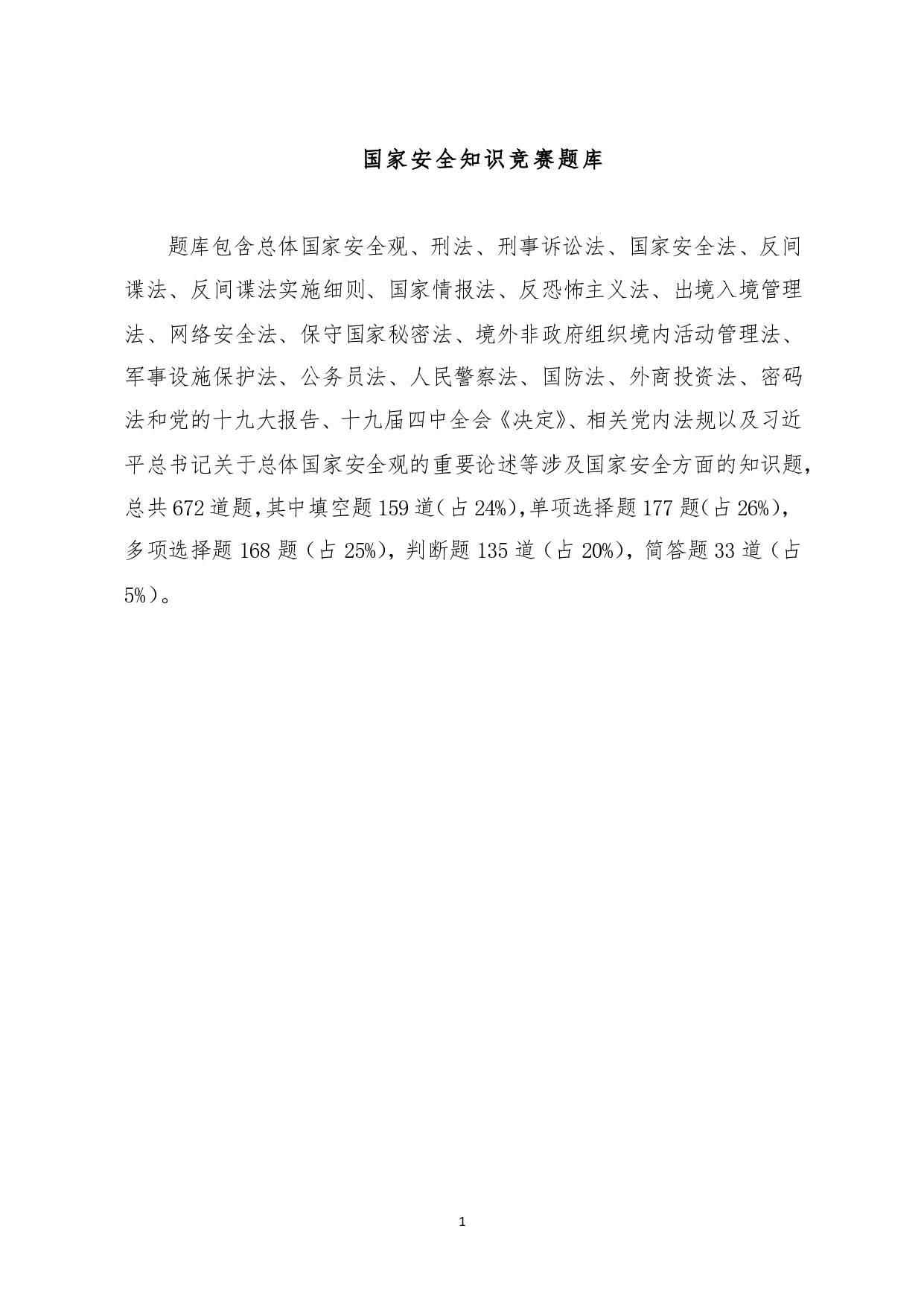 1国家安全知识竞赛题库题库包含总体国家安全观、刑法、刑事诉讼法、国家安全法、反间谍法、反间谍法实施细则、国家情报法、反恐怖主义法、出境入境管理法、网络安全法、保守国家秘密法、境外非政府组织境内活动管理法、军事设施保护法、公务员法、人民警察法、国防法、外商投资法、密码法和党的十九大报告、十九届四中全会《决定》、相关党内法规以及习近平总书记关于总体国家安全观的重要论述等涉及国家安全方面的知识题,总共672道题,其中填空题159道(占24%),单项选择题177题(占26%),多项选择题168题(占25%),判断题135道(占20%),简答题33道(占5%)。23目录习近平总书记重要讲话和党的十九大报...