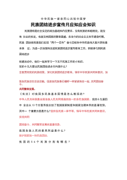 中华民族一家亲同心共筑中国梦民族团结进步宣传月应知应会知识民族团结是社会安定的政治基础和内在要求。没有民族的和睦相处,就没有社会的安定,也就没有国家的繁荣昌盛。在当今的社会主义和平建设时期,民族团结依然是我们实现“两个一百年”奋斗目标和中华民族伟大复兴梦的基本保证。为进一步加强和改进民族团结进步宣传教育工作,积极参与到民族团结进步创建活动中,我们一起来学习一下关于民族工作的小知识。党的十九大提出民族团结进步方向是什么?全面贯彻党的民族政策,深化民族团结进步教育,铸牢中华民族共同体意识,加强各民族交往交流交融,促进各民族像石榴籽一样紧紧抱在一起,共同团结奋斗、共同繁荣发展。《宪法》对我国多民族基...