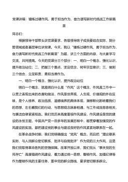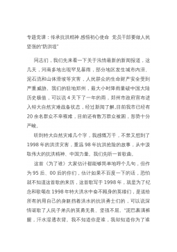 专题党课:传承抗洪精神感悟初心使命党员干部要做人民坚强的“防洪堤”同志们,我们先来看一下关于汛情最新的新闻报道,这几天,河南多地出现罕见暴雨,部分地区发生城市内涝、泥石流和山体滑坡等灾害,人民群众的生命财产安全受到严重威胁。我们的驻地郑州,最大小时降雨量破中国大陆历史极值,可以说4天下了一年的雨,郑州市政府宣布进入特大自然灾难战备状态,经过新闻了解,目前我市已经有20余名群众不幸罹难,目前还有数万群众被困,形势十分严峻。听到特大自然灾难几个字,我感慨万千,不禁又想到了1998年的洪涝灾害,重温98年抗洪抢险的故事,从中汲取伟大的抗洪精神、中国力量。我们先听一首歌曲。这首《为了谁》大家估计都能够...