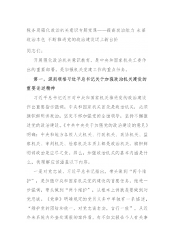 税务局强化政治机关意识专题党课——提高政治能力永葆政治本色不断推进党的政治建设迈上新台阶同志们:开展强化政治机关意识教育,是中央和国家机关工委作出的重要部署,是加强机关党建工作的重点任务。第一,深刻领悟习近平总书记关于加强政治机关建设的重要论述精神习近平总书记近日对中央和国家机关推进党的政治建设作出重要指示强调,中央和国家机关首先是政治机关,必须旗帜鲜明讲政治,坚定不移加强党的全面领导,坚持不懈推进党的政治建设。《中共中央关于加强党的政治建设的意见》明确:中央和地方各级人大机关、行政机关、政协机关、监察机关、审判机关、检察机关本质上都是政治机关,旗帜鲜明讲政治是应尽之责。那么,加强政治机关的基...
