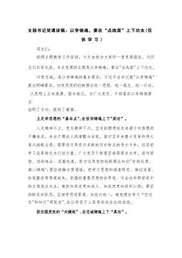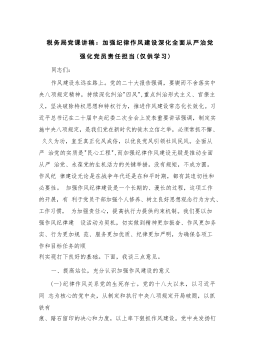税务局党课讲稿:加强纪律作风建设深化全面从严治党强化党员责任担当(仅供学习)同志们:作风建设永远在路上。党的二十大报告强调,要锲而不舍落实中央八项规定精神,持续深化纠治"四风",重点纠治形式主义、官僚主义,坚决破除特权思想和特权行为,推进作风建设常态化长效化。习近平总书记在二十届中央纪委二次全会上发表重要讲话强调,制定实施中央八项规定,是我们党在新时代的徙木立信之举,必须常抓不懈、久久为功,直至真正化风成俗,以优良党风引领社风民风。全面从严治党的实质是"民心工程",而加强纪律作风建设无疑是推动全面从严治党、永葆党的生机活力的关键举措。没有规矩,不成方圆。作风纪律建设无论是在战争年代还是在和平时...
