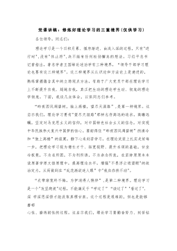 党课讲稿:修炼好理论学习的三重境界(仅供学习)各位领导,同志们:理论学习是一个日积月累、循序渐进、由浅入深的过程,只有"进行时",没有"休止符",决不能有任何松劲懈怠的想法。习近平总书记曾指出,著名学者王国维论述治学有三种境界,“领导干部学习理论也要有这三种境界"。这三种境界从认识论和方法论上是递进的,熟练掌握蕴含其中的立场观点方法,有助于广大党员干部在理论学习上不断提升自我、超越自我,真正把生动的理论学生动、彻底的理论学彻底。下面,我谈几点体会,以供同志们参考。“昨夜西风凋碧树,独上高楼,望尽天涯路”,是第一种境界。这启示我们,理论学习要有"望尽天涯路"那样志存高远的追求,高瞻远瞩,坚定对马...