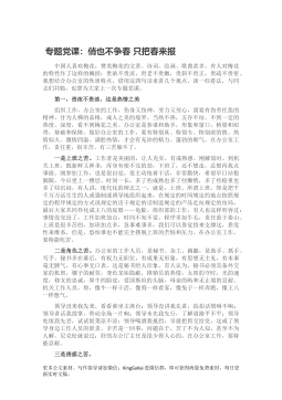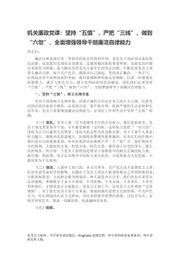 机关廉政党课:坚持“五慎”,严把“三线”,做到“六勿”,全面增强领导干部廉洁自律能力同志们:廉洁自律是我们党一贯倡导的优良传统和作风,是党员干部必须具备的优良品格,也是我们党强化自身建设,克服消极因素的重要举措。各级党组织都应采取得力措施,着力解决党性党风方面存在的突出问题,不断促进党员干部带头廉洁自律。每个共产党员,都要从自己做起,坚持清正廉洁,一身正气,经得起改革开放和执政的考验。我们要旗帜鲜明地反对腐败,以进一步增强党的凝聚力、感召力和号召力,树立党和政府的崇高威望。因此我们必须坚持“五慎”,严把“三线”,做到“六勿”,全面增强领导干部廉洁自律能力。一、坚持“五慎”,树立先锋形象党员干部...