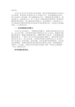 同志们:习近平总书记在不同场合多次强调,我们党要始终做到不忘初心、牢记使命,把党和人民事业长长久久推进下去,必须增强政治意识,善于从政治上看问题,善于把握政治大局,不断提高政治判断力、政治领悟力、政治执行力。对广大党员干部特别是各级领导干部要带头旗帜鲜明讲政治,带头提高政治判断力、政治领悟力、政治执行力,在完成新时代新阶段党的历史使命中发挥重要作用,以实际行动迎接党的二十大胜利召开。一、切实增强政治判断力习近平总书记指出:“增强政治判断力,就要以国家政治安全为大、以人民为重、以坚持和发展中国特色社会主义为本,增强科学把握形势变化、精准识别现象本质、清醒明辨行为是非、有效抵御风险挑战的能力。”领...