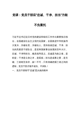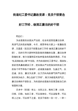 街道纪工委书记廉政党课:党员干部要念好三字经,做清正廉洁的好干部 同志们: 为全面落实全面从严治党,在全街道营造廉洁自律、风清气正的良好氛围,今天,很荣幸给大家上一堂廉政党课,主题是《党员员干部要念好三字经做清正廉洁的好干部》。目的引导大家时时刻刻保持清醒的头脑,廉洁自律防微杜渐,努力克服和应对各种复杂的风险和诱惑,不在“乱花渐欲迷人眼”中沦陷。作为街道的纪工委书记,我深知,抓好党风廉政建设工作,把全面从严治党落实到街道工作的各个环节和各个领域中,必须激浊扬清、弘扬正气,以忠诚、担当、廉洁为支撑,以刀刃向内的勇气和严以律己的作风为动力,用心念好“三字经”,努力为锻造风清气正、廉洁自律的干部...