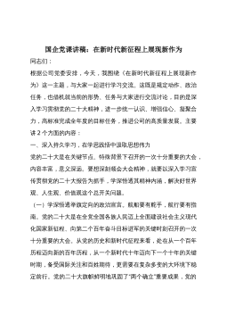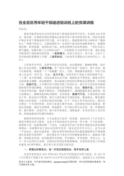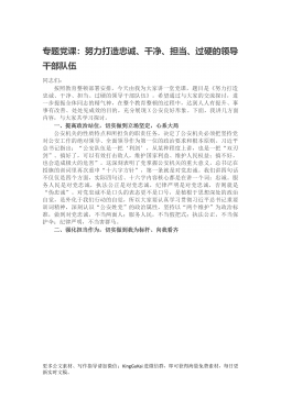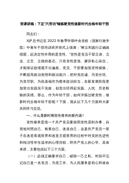 党课讲稿:下足”六苦功”锤炼硬党性做新时代合格年轻干部同志们:XJP总书记在2022年春季学期中央党校(国家行政学院)中青年干部培训班开班式上强调:”树立和践行正确政绩观,起决定性作用的是党性。”党性是党员干部立身、立业、立言、立德的基石。只有党性坚强、摒弃私心杂念,才能保证政绩观不出偏差。党员、干部要加强党性锻炼,不断提高政治觉悟和政治能力,把对党忠诚、为党分忧、为党尽职、为民造福作为根本政治担当,在新发展阶段更加突出实践实干实效,创造出经得起实践、人民、历史检验的实绩。那么,作为年轻干部,如何淬炼过硬党性,做新时代合格年轻干部呢?下面,我从以下几个方面和大家共同学习交流。一、什么是新时期党...