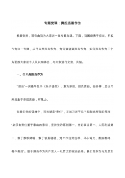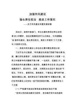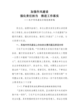 加强作风建设强化责任担当推进工作落实——关于作风建设专题党课讲稿同志们,按照市直部门、单位主要负责同志带头讲党课的工作要求,结合近期调研及学习认识体会,今天我围绕“加强作风建设、强化责任担当、推进工作落实”三个方面,与大家探讨交流。一、系统内作风建设上存在的主要问题及原因分析习近平总书记强调,“作风建设关系我们党能不能长期执政、履行好执政使命”;在推进党的建设新的伟大工程要一以贯之中强调“作风问题绝不是小事,一旦成风,危害巨大”。我们系统的作风建设整体上是好的,局属各单位在各自业务领域真抓实干、担当作为,但是,对照民主生活会中指出的“不担当、不作为,爱惜羽毛、患得患失,干事创业精气神不够,碰到...