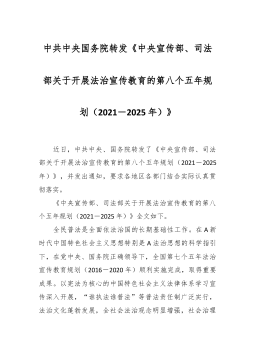 中共中央国务院转发《中央宣传部、司法部关于开展法治宣传教育的第八个五年规划(2021-2025年)》 近日,中共中央、国务院转发了《中央宣传部、司法部关于开展法治宣传教育的第八个五年规划(2021-2025年)》,并发出通知,要求各地区各部门结合实际认真贯彻落实。 《中央宣传部、司法部关于开展法治宣传教育的第八个五年规划(2021-2025年)》全文如下。 全民普法是全面依法治国的长期基础性工作。在A新时代中国特色社会主义思想特别是A法治思想的科学指引下,在党中央、国务院正确领导下,全国第七个五年法治宣传教育规划(2016-2020年)顺利实施完成,取得重要成果。以宪法为核心的中国特色社...