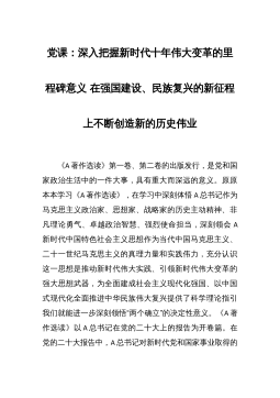 党课:深入把握新时代十年伟大变革的里程碑意义在强国建设、民族复兴的新征程上不断创造新的历史伟业 《A著作选读》第一卷、第二卷的出版发行,是党和国家政治生活中的一件大事,具有重大而深远的意义。原原本本学习《A著作选读》,在学习中深刻体悟A总书记作为马克思主义政治家、思想家、战略家的历史主动精神、非凡理论勇气、卓越政治智慧、强烈使命担当,深刻领会A新时代中国特色社会主义思想作为当代中国马克思主义、二十一世纪马克思主义的真理力量和实践伟力,充分认识这一思想是推动新时代伟大实践、引领新时代伟大变革的强大思想武器,为全面建成社会主义现代化强国、以中国式现代化全面推进中华民族伟大复兴提供了科学理论指引我...