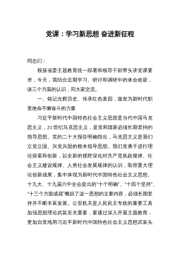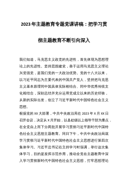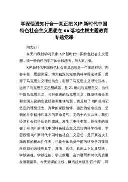 学深悟透知行合一真正把XJP新时代中国特色社会主义思想在xx落地生根主题教育专题党课同志们:今天由我就学习贯彻XJP新时代中国特色社会主义思想,谈一些自己的学习体会和感悟,与大家共勉。XJP新时代中国特色社会主义思想是一个主题鲜明、内容丰富、思想深邃、博大精深的完整的科学理论体系,贯穿了马克思主义理想信念,彰显了马克思主义理论品格,运用了马克思主义思想武器,是21世纪马克思主义、当代中国马克思主义、与时俱进的马克思主义,既凝结着全党和全国人民的实践经验和集体智慧,也反映了XJP总书记坚定的理想信念、真挚的家国情怀、强烈的使命担当、坚韧的斗争精神和非凡的革命勇气。党的十八大以来,我们经济社会取得...