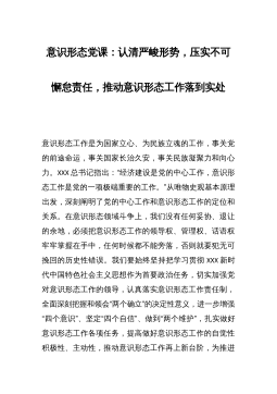 意识形态党课:认清严峻形势,压实不可懈怠责任,推动意识形态工作落到实处意识形态工作是为国家立心、为民族立魂的工作,事关党的前途命运,事关国家长治久安,事关民族凝聚力和向心力。习近平总书记指出:“经济建设是党的中心工作,意识形态工作是党的一项极端重要的工作。”从唯物史观基本原理出发,深刻阐明了党的中心工作和意识形态工作的定位和关系。在意识形态领域斗争上,我们没有任何妥协、退让的余地,必须把意识形态工作的领导权、管理权、话语权牢牢掌握在手中,任何时候都不能旁落,否则就要犯无可挽回的历史性错误。我们要始终坚持把学习贯彻XXX新时代中国特色社会主义思想作为首要政治任务,切实加强党对意识形态工作的领导,...