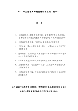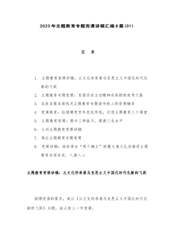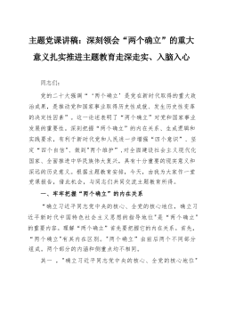 主题党课讲稿:深刻领会“两个确立”的重大意义扎实推进主题教育走深走实、入脑入心同志们:党的二十大强调“‘两个确立’是党在新时代取得的重大政治成果,是推动党和国家事业取得历史性成就、发生历史性变革的决定性因素”。这一论述表明了“两个确立”对党和国家事业发展的重要性。深刻把握“两个确立”的内在关系、生成逻辑和实践要求,有利于新时代党和人民进一步增强“四个意识”、坚定“四个自信"、做到"两个维护”,对全面建设社会主义现代化国家、全面推进中华民族伟大复兴,具有十分重要的现实意义和深远的历史意义。根据主题教育安排,今天,由我为大家作一堂党课报告,借此机会,与同志们共同交流主题教育所得。一、牢牢把握“两个...