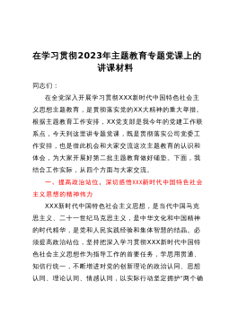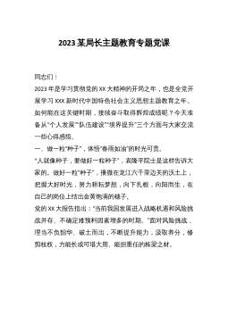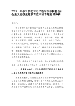 2023年学习贯彻习近平新时代中国特色社会主义思想主题教育读书班专题党课讲稿同志们:学习贯彻习近平新时代中国特色社会主义思想主题教育读书班今天正式开班。举办读书班,既是开展主题教育的重要抓手,也是深化理论学习的重要方法,目的是从领导干部做起,集中时间,集中精力,静下心来,通读、精读、研读原著原文原理,在深化、内化、转化上下功夫,切实做到内化于心、外化于形。这次读书班共分两期进行,这一期聚焦“学思想、强党性”,解决思想层面的问题;下一期聚焦“重实践、建新功”,解决实践层面的问题,在理论和实践的结合中,把习近平新时代中国特色社会主义思想学深悟透做实。下面,我结合自己的学习体会,与大家共同交流学习,...
