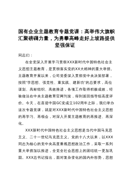 国有企业主题教育专题党课:高举伟大旗帜汇聚磅礴力量,为勇攀高峰走好上坡路提供坚强保证同志们:在全党深入开展学习贯彻XXX新时代中国特色社会主义思想主题教育,是贯彻落实党的XX大精神的重大举措。主题教育开展以来,公司党委深入贯彻党中央决策部署,按照“学思想、强党性、重实践、建新功”的总要求,高位谋划、高标组织、高效推进,各项工作取得积极成效,经验做法在中央主题教育官网刊发,得到巡回指导组高度评价。今天,在喜迎中国GC党成立102周年之际,我们举办这次专题党课,就是对XXX新时代中国特色社会主义思想的再学习、再领会,对深入开展主题教育的再推进、再深化。XXX新时代中国特色社会主义思想是当代中国马克...