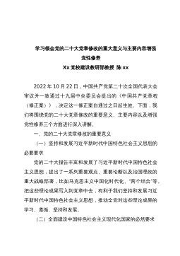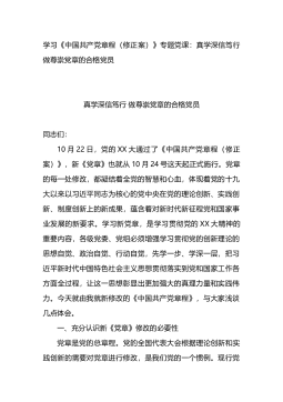 学习《中国共产党章程(修正案)》专题党课:真学深信笃行做尊崇党章的合格党员真学深信笃行做尊崇党章的合格党员同志们:10月22日,党的XX大通过了《中国共产党章程(修正案)》,新《党章》也就从10月24号这天起正式施行。党章的每一处修改,都凝结着全党的智慧和心血,体现着党的十九大以来以习近平同志为核心的党中央在党的理论创新、实践创新、制度创新上的新成果,蕴含着对新时代新征程党和国家事业发展的新要求。学习新党章,是学习贯彻党的XX大精神的重要内容,各级党委、党组必须增强学习贯彻党的创新理论的思想自觉、政治自觉、行动自觉,先学一步、学深一层,把习近平新时代中国特色社会主义思想贯彻落实到党和国家工作各...