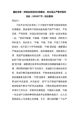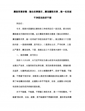 廉政党课讲稿:强化纪律意识,廉洁履职尽责,做一名忠诚干净担当的好干部同志们:今天,很高兴受邀和从事党务工作的同志们一起交流、探讨党风廉政建设方面的有关问题。这次廉政党课的主题是《强化纪律意识,廉洁履职尽责,做一名忠诚干净担当的好干部》。我主要谈三个方面的内容:一是保持清醒,坚守定力;二是深化认识,严守纪律;三是从严要求,廉洁自律。下面,我就从这三个方面和大家作一交流。一、保持清醒,坚守定力党的十八大以来,以习近平同志为核心的党中央坚持党要管党、全面从严治党,以强烈的历史责任感、深沉的使命忧患感、顽强的意志品质,以重典治乱的决心,以壮士断腕的勇气,坚持“不敢腐、不能腐、不想腐”齐抓并举,持续深入...