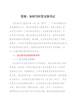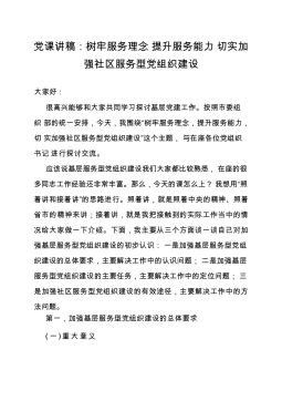 党课讲稿:树牢服务理念提升服务能力切实加强社区服务型党组织建设大家好:很高兴能够和大家共同学习探讨基层党建工作。按照市委组织部的统一安排,今天,我围绕“树牢服务理念,提升服务能力,切实加强社区服务型党组织建设”这个主题,与在座各位党组织书记进行探讨交流。应该说基层服务型党组织建设我们大家都比较熟悉,在座的很多同志工作经验还非常丰富。那么,今天的课怎么上?我想用“照着讲和接着讲”的思路进行。照着讲,就是照着中央的精神、照着省市的精神来讲;接着讲,就是我把接触到的实际工作当中的情况给大家做一下介绍。下面,我主要从三个方面谈一谈自己对加强基层服务型党组织建设的初步认识:一是加强基层服务型党组织建设的...