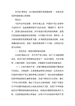 作示范勇争先,全力推动高新区高质量发展——在机关党支部专题党课上的讲稿同志们:习近平总书记强调,“好学才能上进。中国共产党人依靠学习走到今天,也必然要依靠学习走向未来。”重视学习、善于学习,是我们党的优良传统,对干部进行理论和党性教育,是我们党加强自身建设的宝贵经验。今天我以“作示范、勇争先,全力推动高新区高质量发展”为题,从“锻造坚定的政治品格、永葆清廉的政治本色、创造一流的发展实绩”3个方面,与同志们交流几点体会。一、坚定信念,锻造过硬的政治品格古话说“相由心生”。对于共产党人来说,这个“心”就是理想信念。党员干部只有理想信念坚定了,站位才能高,方向才能明,心胸才能宽,担当才能强,才能做到...