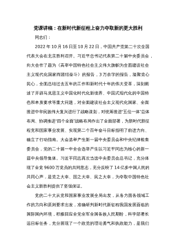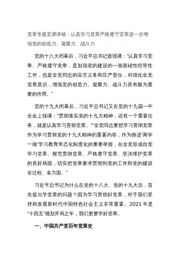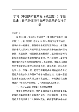 学习《中国共产党章程(修正案)》专题党课:真学深信笃行做尊崇党章的合格党员同志们:10月22日,党的XX大通过了《中国共产党章程(修正案)》,新《党章》也就从10月24号这天起正式施行。党章的每一处修改,都凝结着全党的智慧和心血,体现着党的十九大以来以习近平同志为核心的党中央在党的理论创新、实践创新、制度创新上的新成果,蕴含着对新时代新征程党和国家事业发展的新要求。学习新党章,是学习贯彻党的XX大精神的重要内容,各级党委、党组必须增强学习贯彻党的创新理论的思想自觉、政治自觉、行动自觉先学一步、学深一层,把习近平新时代中国特色社会主义思想贯彻落实到党和国家工作各方面全过程,让这一思想彰显出更加强...