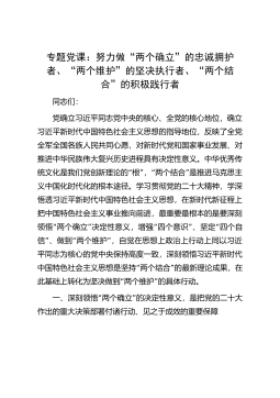 专题党课:努力做“两个确立”的忠诚拥护者、“两个维护”的坚决执行者、“两个结合”的积极践行者同志们:党确立习近平同志党中央的核心、全党的核心地位,确立习近平新时代中国特色社会主义思想的指导地位,反映了全党全军全国各族人民共同心愿,对新时代党和国家事业发展、对推进中华民族伟大复兴历史进程具有决定性意义。中华优秀传“”“”统文化是我们党创新理论的根,两个结合是推进马克思主义中国化时代化的根本途径。学习贯彻党的二十大精神,学深悟透习近平新时代中国特色社会主义思想,在新时代新征程上把中国特色社会主义事业推向前进,最重要最根本的是要深刻“”“”“领悟两个确立决定性意义,增强四个意识、坚定四个自”“”信、...