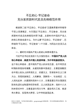 不忘初心牢记使命充分发挥新时代党员先锋模范作用根据第二批“不忘初心、牢记使命”主题教育要求和领导干部上党课规定,今天我以“不忘初心,牢记使命,充分发挥新时代党员先锋模范作用”为题,从新时代中国共产党人的初心和使命是什么、为什么要“不忘初心、牢记使命”,怎样做到“不忘初心、牢记使命”3个方面,与同志们交流几点体会。一、新时代中国共产党人的初心和使命是什么习近平总书记在党的十九大报告指出:中国共产党人的初心和使命,就是为中国人民谋幸福,为中华民族谋复兴。这个初心和使命,是中国共产党人的永恒主题,在不同历史时期的表现各有侧重。从建党到新中国成立,主要是推翻压在中国人民头上的帝国主义、封建主义、官僚资...
