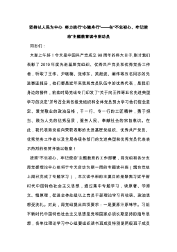 坚持以人民为中心努力践行“心随舟行”——在“不忘初心、牢记使命”主题教育读书班动员同志们:大家上午好!今天是中国共产党成立98周年的伟大日子,刚才我们表彰了2019年度先进基层党组织、优秀共产党员和优秀党务工作者,听取了王伟、尹晓楠、张修东、英起波、阚伟等五名同志的先进事迹报告,他们都是近年来我局党员队伍中的优秀代表,是我们身边的榜样,前些时局党组专门印发了“关于向王伟等五名先进典型学习的决定”并号召全局各级党组织和全体党员努力学习他们信念坚定、爱党敬业的政治品格,干一行、专一行的工匠精神,勇于担当、敢为人先的优秀品质,服务人民、奉献社会的宗旨意识。在此,我代表局党组向荣获表彰的先进基层党组织...