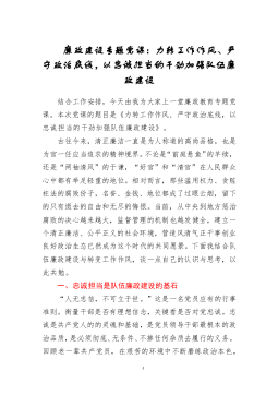 ·1廉政建设专题党课:力转工作作风、严守政治底线,以忠诚担当的干劲加强队伍廉政建设结合工作安排,今天由我为大家上一堂廉政教育专题党课。本次党课的题目是《力转工作作风、严守政治底线,以忠诚担当的干劲加强队伍廉政建设》。古往今来,清正廉洁一直是为人称道的高尚品格,也是为官一任应当追求的精神境界。不论是“前庭悬鱼”的羊续,还是“两袖清风”的于谦,“好官”和“清官”在人民群众心中都有举足轻重的地位。相对而言,那些滥用权力、贪赃枉法的腐败份子,名誉、金钱、地位都成了过眼云烟,留下的只有逝去的自由和无尽的悔恨。当前,从中央到地方惩治腐败的决心越来越大,监督管理的机制也越发健全,建立一个清正廉洁、公平正义的...