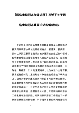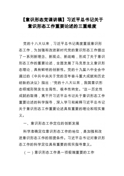 【意识形态党课讲稿】习近平总书记关于意识形态工作重要论述的三重维度党的十八大以来,习近平总书记高度重视意识形态工作,为加强和改进新时代党的意识形态工作提出了一系列新理念、新观点、新战略,形成了关于意识形态工作的重要论述,全面发展了马克思主义意识形态理论,具有鲜明的创新性。党的十九届六中全会中通过的《中共中央关于党的百年奋斗重大成就和历史经验的决议》指出:“党的十八大以来,我国意识形态领域形势发生全局性、根本性转变。”这一历史性成就的取得,离不开习近平总书记关于意识形态工作重要论述的科学指导,深入学习和阐释习近平总书记关于意识形态工作重要论述具有重要的理论和现实意义。一、意识形态工作定位的创新发...