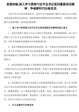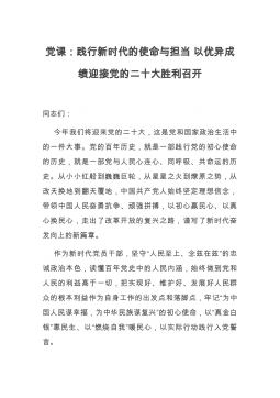 主题党课讲稿:强信念、树正气、践宗旨努力做守纪律和规矩的新时代合格党员各位党员:大家下午好!根据年度计划安排,今天,由我给大家讲一次党课,这次党课的主题是《强信念、树正气、践宗旨努力做守纪律和规矩的新时代合格党员》。XJP总书记强调,基层是党的执政之基、力量之源。要把全面从严治党落实到每个支部、每名党员,这也是对全体党员提出的新要求。全体党员要坚定理想信念,增强政治意识、大局意识、核心意识、看齐意识,严守政治纪律和政治规矩,强化宗旨观念,勇于担当作为,在工作、学习和社会生活中发挥先锋模范作用。一、坚定理想信念,提高党性觉悟共产党人在为党的事业奋斗过程中必须坚持不懈地加强党性修养。党性修养包括理...