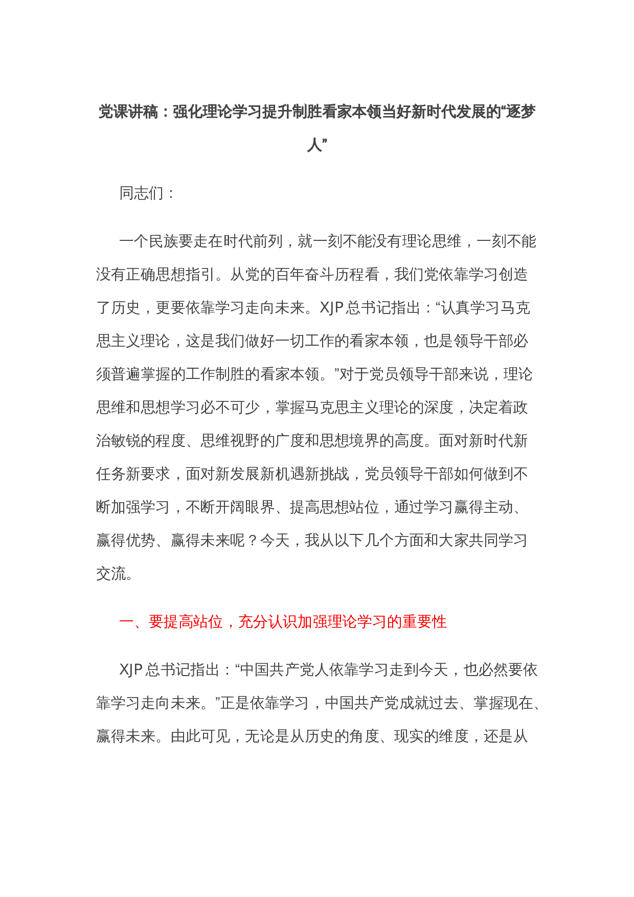 党课讲稿:重温入党誓词砥砺前进初心同志们:今天参加上党课的每名同志,都是中国共产党的正式或者预备党员。我们每个人都曾经在鲜红的党旗下庄严宣誓:我志愿加入中国共产党,拥护党的纲领,遵守党的章程,履行党员义务,执行党的决定,严守党的纪律,保守党的秘密,对党忠诚,积极工作,为共产主义奋斗终身,随时准备为党和人民牺牲一切,永不叛党。上述入党誓词,是由《党章》规定的,是每个党员在入党时向组织表明的决心与态度,是对入党以后做什么、不做什么的郑重承诺和许愿,是对党员要求的精华和浓缩,进一步说,入党誓词就是我们共产党员的理想信念和精神支柱,是我们对党组织的初心。庄严的誓词,不仅使我们得到心灵的净化和升华,增强...