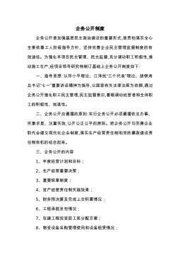 企务公开制度企务公开是加强基层民主政治建设的重要形式,是贯彻落实全心全意依靠工人阶级指导方针、坚持完善企业民主管理监督制度的有效途径。为强化本项目民主管理、民主监督,充分调动职工积极性,推动施工生产,经项目领导研究特制订基础上企务公开制度如下∶一、指导思想∶以邓小平理论、江泽民“三个代表”理论、胡锦涛总书记“七一”重要讲话精神为指导,以国家有关法律法规为依据,通过企务公开强化职工民主管理,民主监督意识,着眼调动经营者和全体职工的积极性、创造性。二、企务公开应遵循的原则∶实行企务公开必须遵循依法办事、实事求是、注重实效,公开公正公平的原则。把企务公开与完善企业职代会建立现代化企业制度,落实生产经...