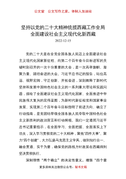 公文堂公文写作之家,体制人加油站坚持以党的二十大精神统揽西藏工作全局全面建设社会主义现代化新西藏2022-12-15党的二十大是在全党全国各族人民迈上全面建设社会主义现代化国家新征程、向第二个百年奋斗目标进军的关键时刻召开的一次十分重要的大会,是一次高举旗帜、凝聚力量、团结奋进的大会。习近平总书记的报告,站位高远、视野宏阔,守正创新、开拓奋进,深刻阐释了新时代坚持和发展中国特色社会主义的一系列重大理论和实践问题,描绘了全面建设社会主义现代化国家、全面推进中华民族伟大复兴的宏伟蓝图,为新时代新征程党和国家事业发展、实现第二个百年奋斗目标指明了前进方向、确立了行动指南,是党团结带领全国各族人民夺取...
