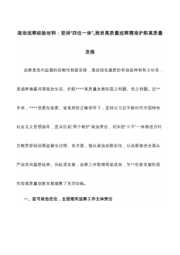 政治巡察经验材料:坚持“四位一体”,推进高质量巡察精准护航高质量发展巡察是党内监督的战略性制度安排,是巡视在基层的有效延伸和有力补充,是涵养海晏河清政治生态、护航****高质量发展的国之利器、党之利器。近**年来,****党委在省委、省政府的正确领导下,坚持以习近平新时代中国特色社会主义思想指导,坚决扛起“两个维护”政治责任,切实把“三不”一体推进方针方略贯穿到巡察监督全过程、各方面,强化政治巡察定位,以巡察推进全面从严治党向基层延伸、向纵深发展,巡察工作取得明显成效,为**在新发展阶段实现高质量创新发展凝聚了充沛动能。一、坚守政治定位,全面落实巡察工作主体责任巡察是政治巡察,本质是政治监督。...