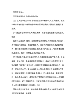 医院双带头人医院学科带头人选拔与激励机制为了引入竞争激励机制,培养素质医学学科带头人,提高医疗、教学、科研水平,促进学科建设健康快速发展,结合我院实际情况,特制定本办法。(一)涵义界定学科带头人:知识渊博,富于创造性思维和开拓意识,能把握学科发展方向,组织、团结和带动学科梯队为学科发展共同奋斗。具有敏锐的观察力、丰富的想象力、创造性思维能力和高超的判断力,能不断自我完善和实现知识更新;学风严谨正派,有科学奉献精神,在医疗、教学、科研队伍中起核心作用。(二)选拔条件重点专科学科带头人必须同时满足以下条件:1、身体健康,政治合格,具备良好的医德医风;2、具备主治医师卫生专业技术职务,有较高的业务水...
