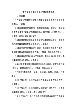 “奋力强省会喜迎二十大”知识竞赛题库一、判断题1.“强省会”战略在2021年湖南省第十二次党代会上被首次提出。(正确)2.淳口镇展现使命担当,抢抓战略机遇,制定了《淳口镇关于贯彻落实“强省会”战略的行动计划(2022—2025年)》。(错误,应为2022-2026年)3.淳口锚定建设成为金阳新城“产业转移的承接区、旅游休闲的后花园和健康养生的首选地”。(正确)4.淳口坚决守住粮食安全底线,巩固提升粮食生产能力,确保稳住粮食种植面积6.7万亩。(错误,应为6.6万亩)5.淳口镇总面积233.6平方公里,有林地22.18万亩,森林覆盖率达63.33%。(正确)6.2022年要实现村集体经济收入50...