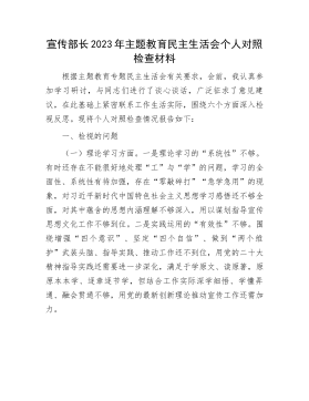 宣传部长2023年主题教育民主生活会个人对照检查材料根据主题教育专题民主生活会有关要求,会前,我认真参加学习研讨,与同志们进行了谈心谈话,广泛征求了意见建议,在此基础上紧密联系工作生活实际,围绕六个方面深入检视反思。现将个人对照检查情况报告如下:一、检视的问题(一)理论学习方面。一是理论学习的“系统性”不够。有时还存在不能很好地处理“工”与“学”的问题,学习的全面性、系统性有待加强,存在“零敲碎打”“急学急用”的现象,对习近平新时代中国特色社会主义思想学习感悟还不够全面,对其中蕴含的思想内涵理解不够深入,用以谋划指导宣传思想文化工作不够到位。二是实践运用的“有效性”不够。围绕增强“四个意识”、...