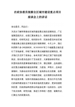 在政协委员视察全区城市建设重点项目座谈会上的讲话 各位委员,同志们:为充分了解和掌握全区城市建设重点项目进展情况,广泛凝聚思想共识,全面汇聚发展合力,助推区委决策部署贯彻落实,经研究决定,组织部分市、区政协委员对全区城市建设重点项目进展情况进行视察调研。今天上午,我们利用两个多小时的时间,对XXXXX等三个城建重点项目进行了实地参观,详细了解全区重点城建项目进展情况。刚才我们又召开了座谈会,各有关部门单位汇报了项目进展情况,部分委员也进行了互动发言,大家都谈得非常好。区委区政府高度重视城市建设工作。通过视察,总的感到,全区重点城建项目建设抓得紧、力度强、声势大,总体进展顺利,为推动全区经济发展...