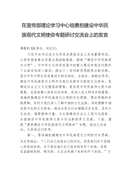 在宣传部理论学习中心组勇担建设中华民族现代文明使命专题研讨交流会上的发言尊敬的XX部长,同志们:习近平总书记在文化传承发展座谈会上发表重要讲话,从党和国家事业发展全局战略高度,围绕“建设中华民族现代文明”,对中华文化传承发展中的重大理论和现实问题作了全面系统深入阐述,提出了一系列新思想新观点新论断,是对中华文明长远发展进行的总体性、全局性、战略性思考。建设中华民族现代文明作为我们在新时代新的文化使命,是建设社会主义文化强国的需要,是实现中华民族伟大复兴的需要,也是构建人类命运共同体、促进人类文明进步的需要。准确把握建设中华民族现代文明的历史逻辑、理论逻辑和实践逻辑,有利于我们深入了解中国的文化...