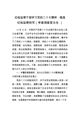 纪检监察干部学习党的二十大精神:锻造纪检监察铁军(审查调查室主任)10月16日,中国共产党第二十次全国代表大会在人民大会堂开幕,习近平总书记代表第十九届中央委员会向党的二十大作报告。按照县纪委监委机关统一部署安排,集中学习了党的二十大报告。我感到,党的二十大报告主题鲜明、思想深邃、站位高远、视野宏阔,坚持守正创新、彰显自信自强、突出战略谋划、贯穿团结奋斗,对新时代中国特色社会主义的认识达到了新高度新境界,为全面建设社会主义现代化国家指明了前进方向,确立了行动指南,是一个凝聚全党智慧、反映人民意愿、对党和国家事业发展具有重大指导作用的纲领性文件。下面,结合近期学习工作和思考,我汇报几点个人的认识...