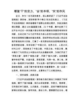 增强“干”的定力、“会”的本领、“实”的作风近日,作为一名市政协委员,我认真研读了《习近平谈治国理政》第四卷,深刻领悟“两个确立”的决定性意义,《习近平谈治国理政》第四卷着眼干部群众的理论需求、实践发展的理论需要,通过109篇重要文章、21个专题,集中反映了习近平总书记对一系列重大理论和实践问题新的深邃思考和科学判断,生动记录了以习近平同志为核心的党中央面对百年变局和世纪疫情相互叠加的复杂局面、团结带领全党全国人民应变局开新局的伟大实践,汇集了一系列原创性的治国理政新理念新思想新战略,科学回答了“中国之问、世界之问、人民之问、时代之问”,深刻阐发了中国之路、中国之治、中国之理,集中展示了马克思...