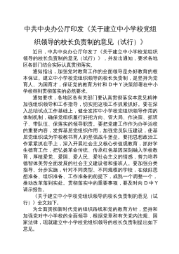 中共中央办公厅印发《关于建立中小学校党组织领导的校长负责制的意见(试行)》近日,中共中央办公厅印发了《关于建立中小学校党组织领导的校长负责制的意见(试行)》,并发出通知,要求各地区各部门结合实际认真贯彻落实。通知指出,加强党对教育工作的全面领导是办好教育的根本保证。建立中小学校党组织领导的校长负责制,是坚持为党育人、为国育才,保证党的教育方针和D中Y决策部署在中小学校得到贯彻落实的必然要求。通知要求,各地区各有关部门要认真贯彻落实本意见精神加强组织领导和工作指导,切实把这项工作抓紧抓好。要在深入总结试点工作基础上,健全发挥中小学校党组织领导作用的体制机制,确保党组织履行好把方向、管大局、作决策...